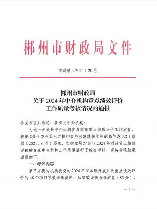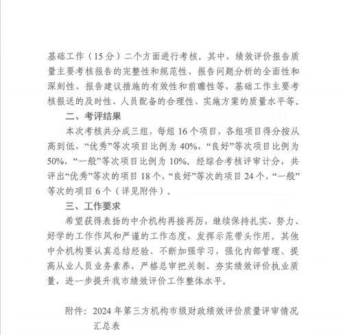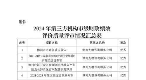 喜报 | 九澧咨询连续三年在郴州市考评中获“优”等发表时间:2025-03-31 15:59 九澧咨询在郴州市财政局2024年中介机构重点绩效评价工作质量考核中获评“优秀”项目4个,“良好”项目2个。这是自2022年以来,九澧咨询连续三年获评“优秀”项目,这份荣誉既是对团队深耕政策研究、严控服务质量的高度认可,也是鞭策我们持续创新的动力。我们将以此为契机,再接再厉,不断提升专业能力和服务水平,为各级政府提供更加优质、高效的财政绩效评价服务,为财政资金提质增效贡献智慧力量。