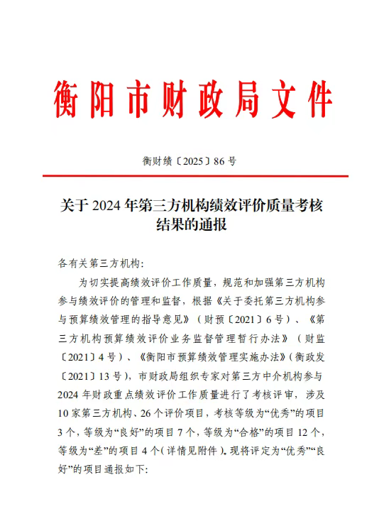 九澧咨询在衡阳市财政局2024年第三方机构绩效评价质量考核中获评“优秀”项目1个,“良好”项目2个。自2023年以来,九澧咨询连续两年获评“优秀”项目,这份荣誉既是对我们服务质量的肯定,也离不开委托方衡阳市财政局的指导与支持。我们深知,预算绩效管理是一项复杂且重要的工作,未来我们将继续秉持专业精神,进一步提升专业能力,为财政管理效能提升贡献“九澧”力量。